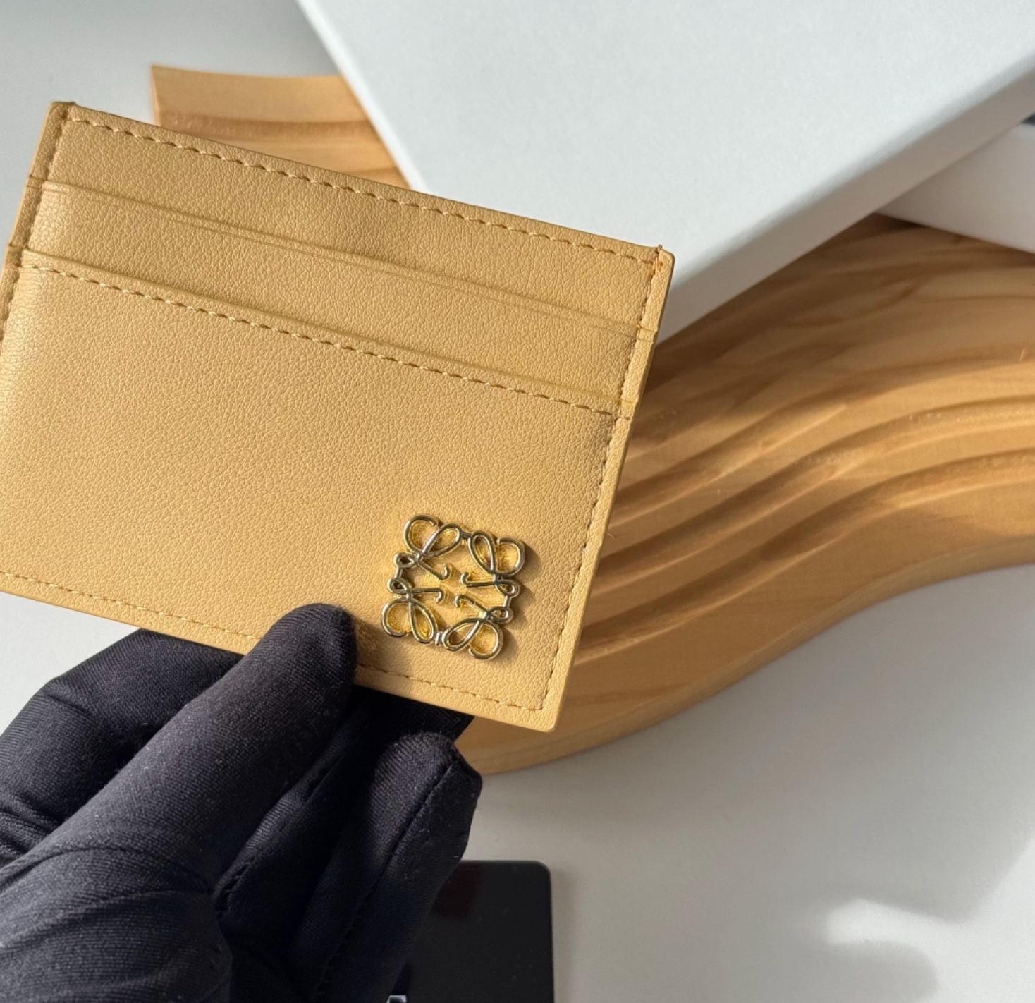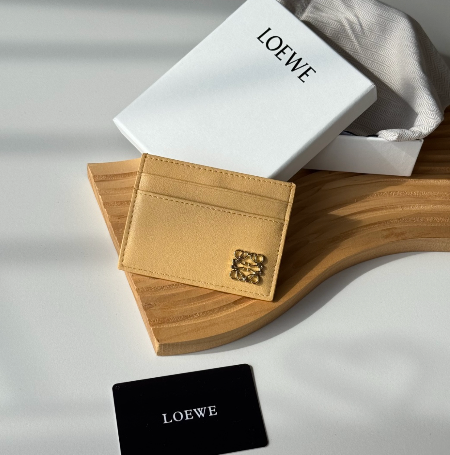 Elegante tarjetero Loewe en tono beige con diseño minimalista y detalle metálico icónico. Un accesorio sofisticado y moderno ideal para llevar tus tarjetas con estilo.